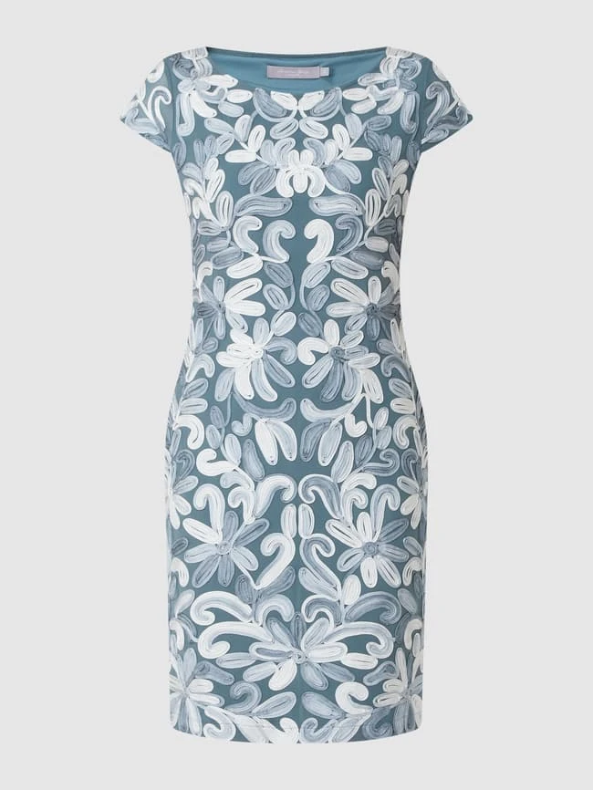 Das Cocktailkleid von Christian Berg Cocktail ist aus einer Materialmischung mit Stretch-Anteil gefertigt. Es zeigt sich in eng anliegender Passform mit floralen Zierborten, Rundhalsausschnitt und Kappärmeln.