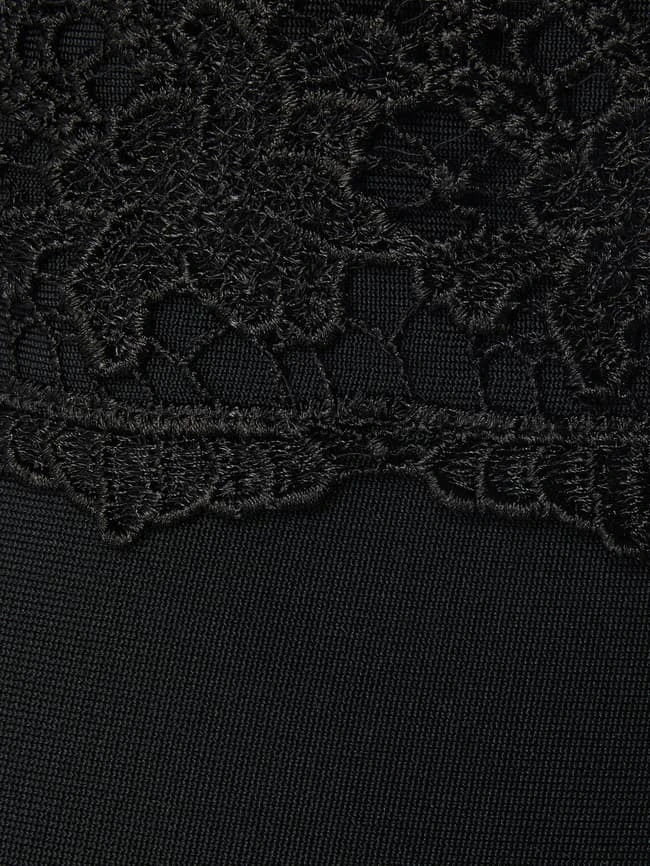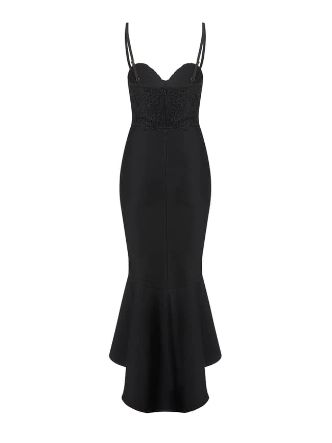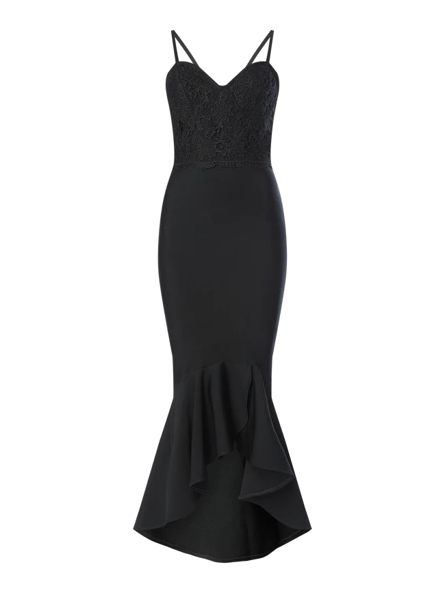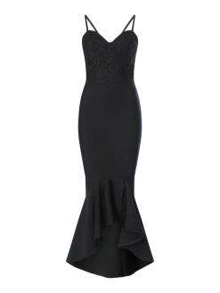 Das Abendkleid von Forever Unique ist aus fein strukturiertem Material gefertigt und kommt im Meerjungfrau-Stil. Es zeigt sich in Vokuhila-Passform mit Oberteil aus Häkelspitze, Herz-Ausschnitt und Volantsaum.