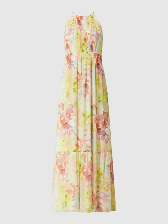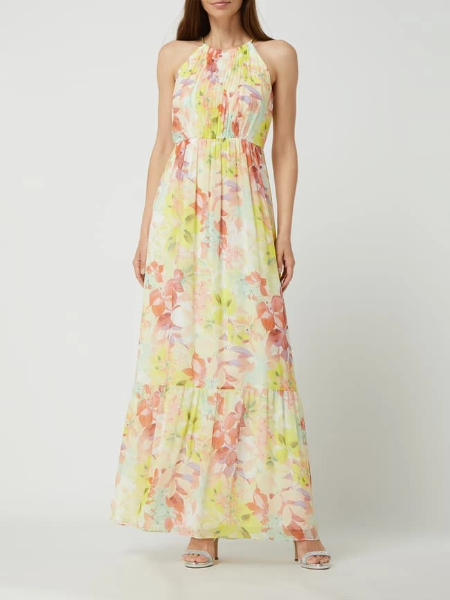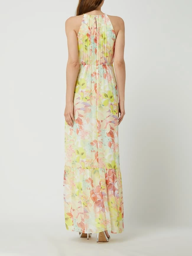 Das Abendkleid von Jake*s Cocktail ist aus Chiffon gefertigt. Es kommt in taillierter Passform mit floralem Muster, amerikanischem Ausschnitt und Volantsaum.