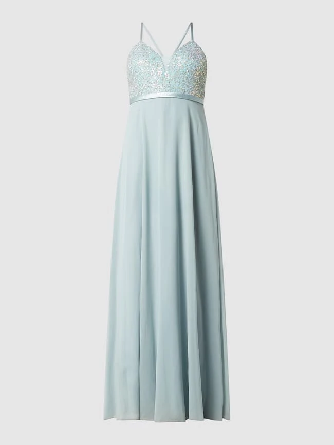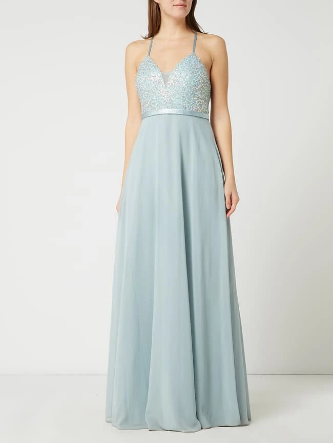Das Abendkleid von Jake*s Cocktail ist aus Mesh und Chiffon gefertigt. Es zeigt sich in taillierter Passform mit wattierten Cups, Pailletten-Applikationen und tiefem Rückenausschnitt.