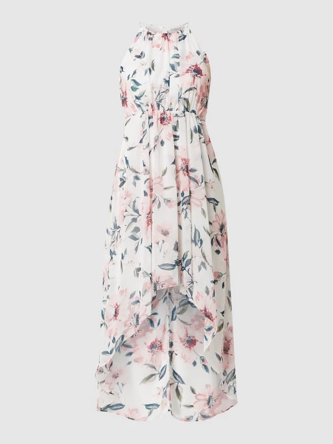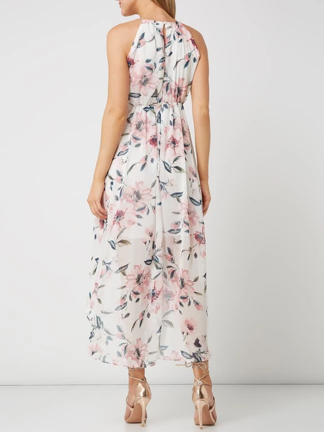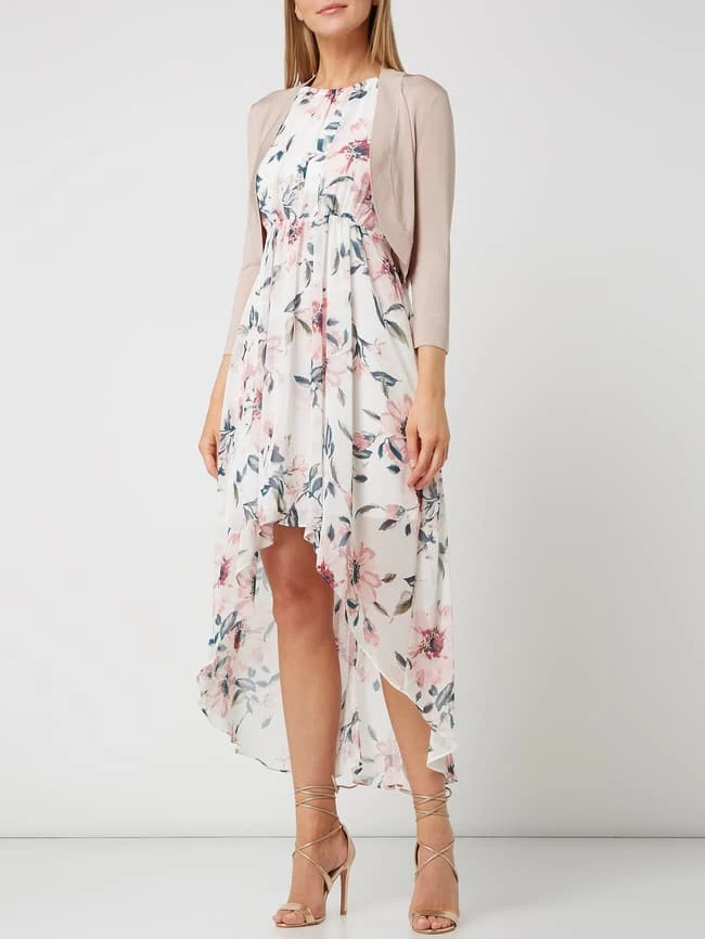 Das Abendkleid von Jake*s Cocktail ist aus leichtem Material gefertigt. Es zeigt sich in Vokuhila-Passform mit Schlüssellochausschnitt auf der Rückseite und floralem Muster.