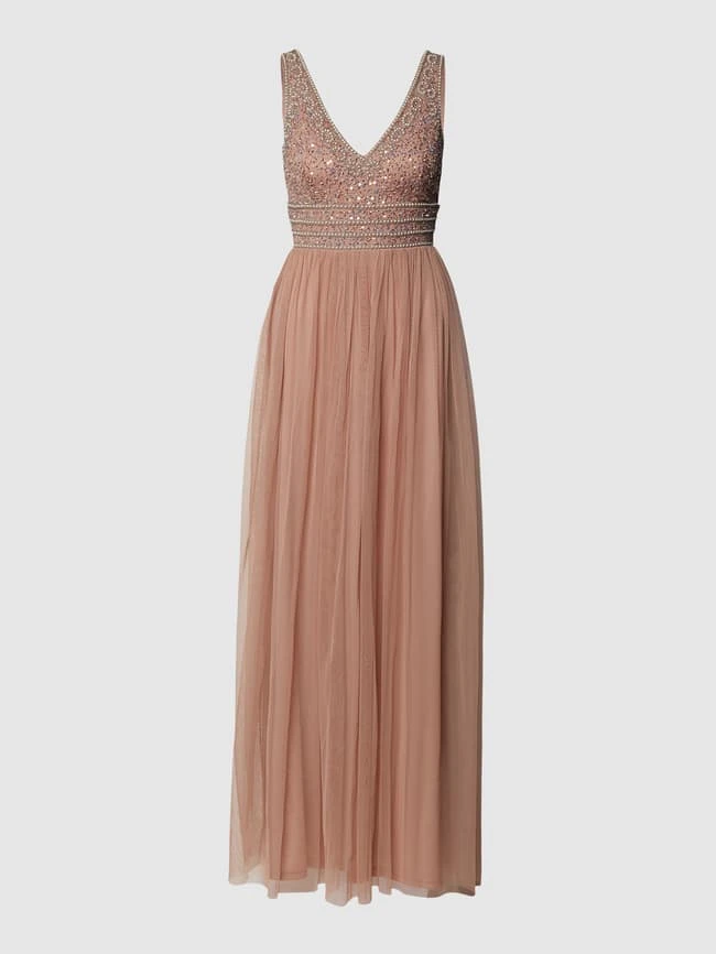 Das Abendkleid von Lace & Beads ist aus strapazierfähigem Material gefertigt und tailliert geschnitten. Es kommt im ärmellosen Design mit V-Ausschnitt, Besatz aus Ziersteinen sowie doppellagigem Rockteil.