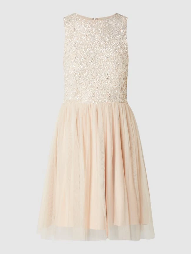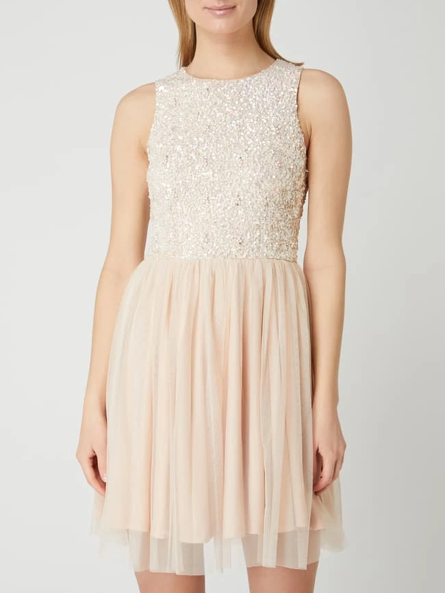 Das Cocktailkleid von Lace & Beads ist aus Mesh gefertigt und tailliert geschnitten. Es zeigt sich mit Rundhalsausschnitt, Pailletten und gerafftem Rockteil.
