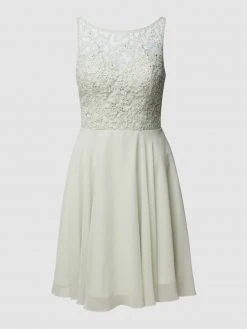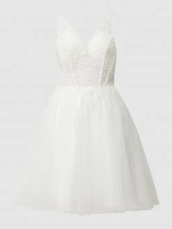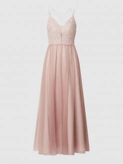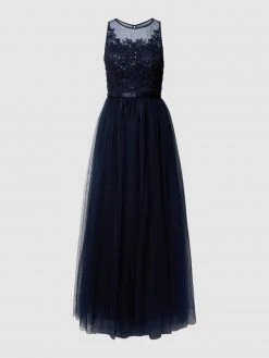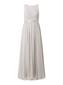 Das Abendkleid von LAONA ist aus Tüll und Chiffon gefertigt. Es zeigt sich in taillierter Passform mit ornamentalen Stickereien und Ziersteinen.