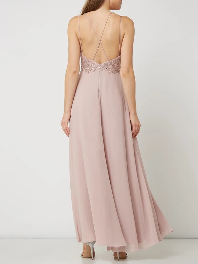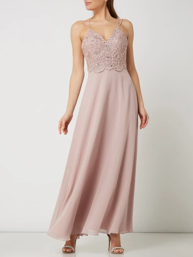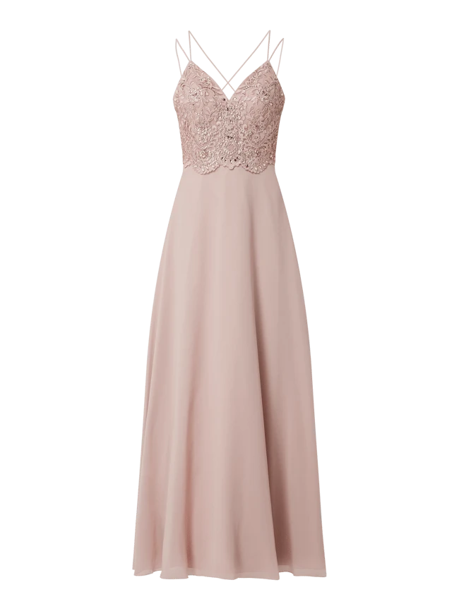 Das Abendkleid von LAONA ist aus Chiffon gefertigt und tailliert geschnitten. Es kommt mit floralen Stickereien, Ziersteinen und ausgestelltem Rockteil.