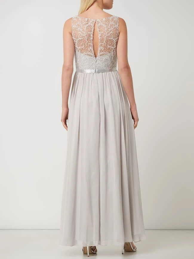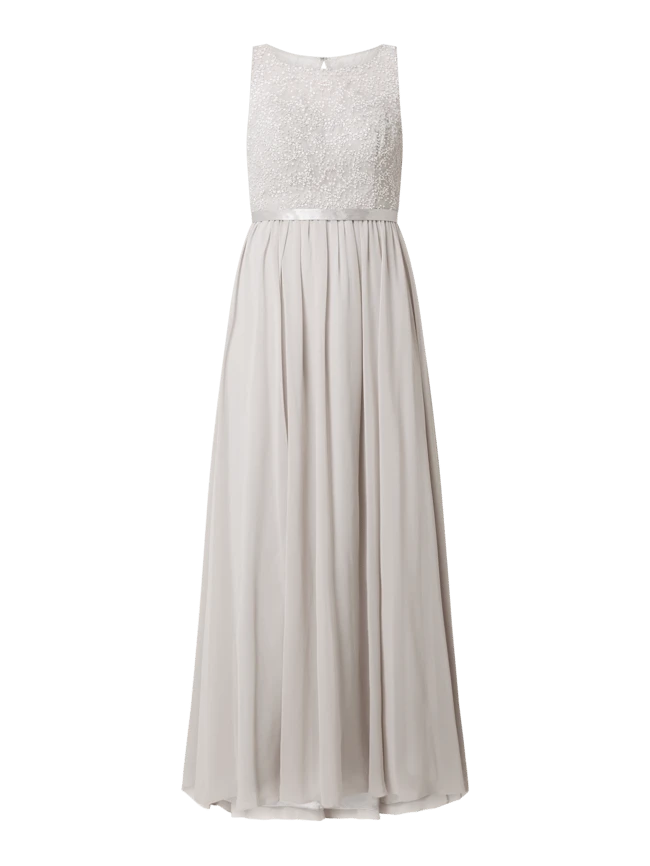 Das Abendkleid von LAONA ist aus Organza und Chiffon gefertigt. Es zeigt sich in taillierter Passform mit Stickereien und Pailletten.