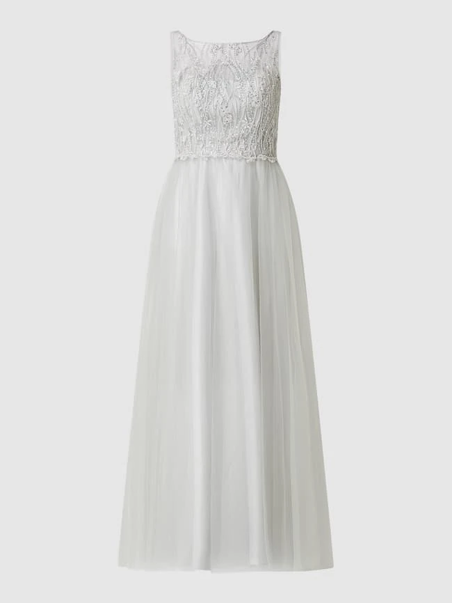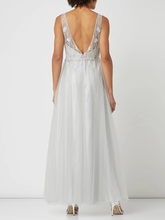 Das Abendkleid von LAONA ist aus Tüll gefertigt und tailliert geschnitten. Es zeigt sich mit floralen Stickereien, Perlen und weit ausgestelltem Rockteil.