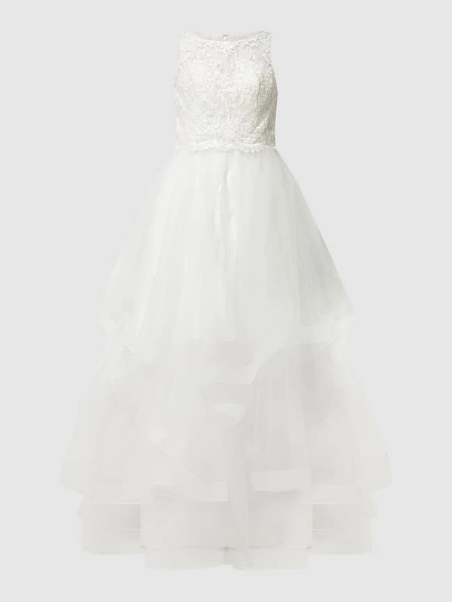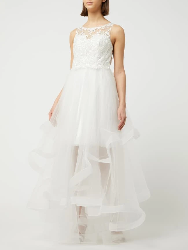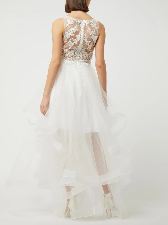 Das Abendkleid von LAONA ist aus Mesh gefertigt und tailliert geschnitten. Es kommt mit floralen Stickereien, Strasssteinen und ausgestelltem Rockteil im Stufen-Look.