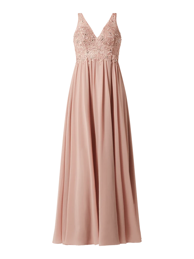 Das Abendkleid von LAONA ist aus Mesh und Chiffon gefertigt. Es kommt in taillierter Passform mit floralen Stickereien, wattierten Cups und ausgestelltem Rockteil.