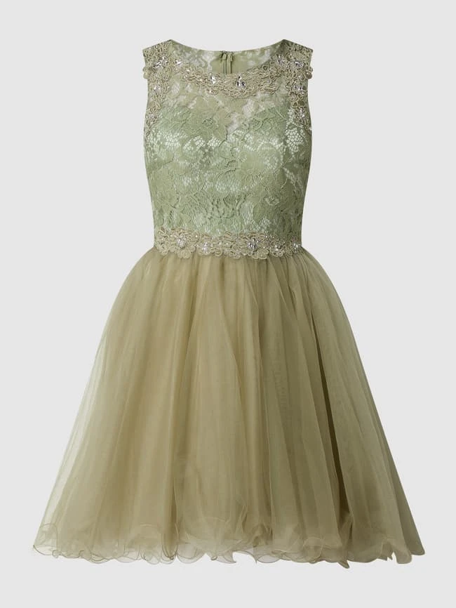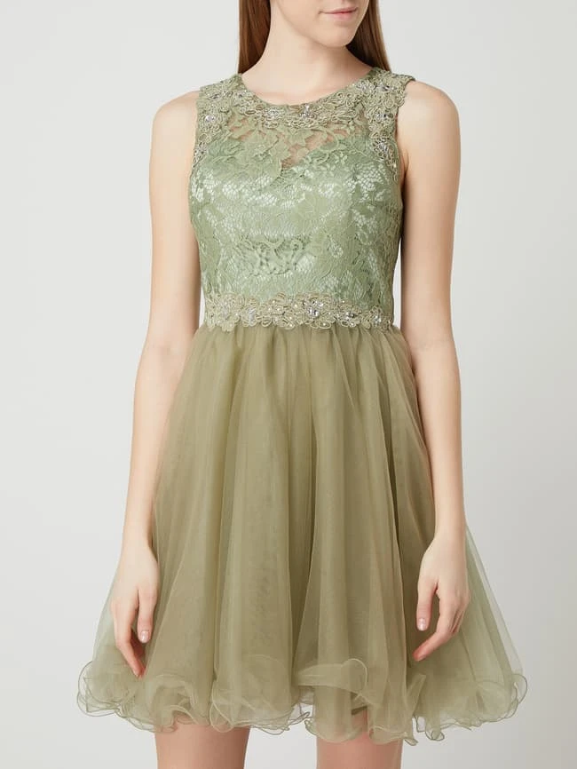 Das Cocktailkleid von LAONA ist aus floraler Spitze und Tüll gefertigt. Es zeigt sich in taillierter Passform mit Ziersteinen, mehrlagigem Rockteil und Muschelsaum.