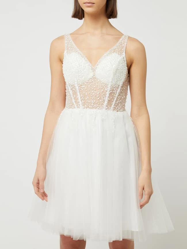 Das Cocktailkleid von LAONA ist aus Tüll gefertigt und tailliert geschnitten. Es zeigt sich in partiell transparenter Optik mit schmalen Trägern, Strasssteinen und Zierperlen.