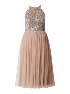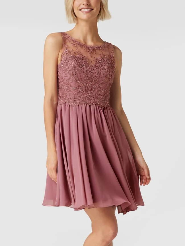 Das Cocktailkleid von LAONA ist aus strapazierfähigem Material gefertigt und tailliert geschnitten. Es zeigt sich mit floralen Stickereien, Ziersteinen und mehrlagigem Rockteil.