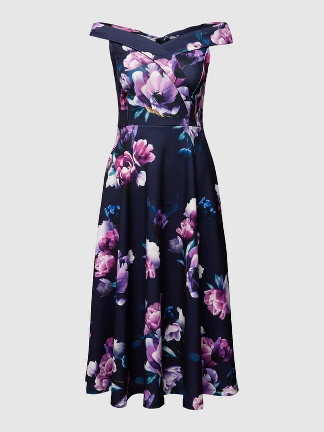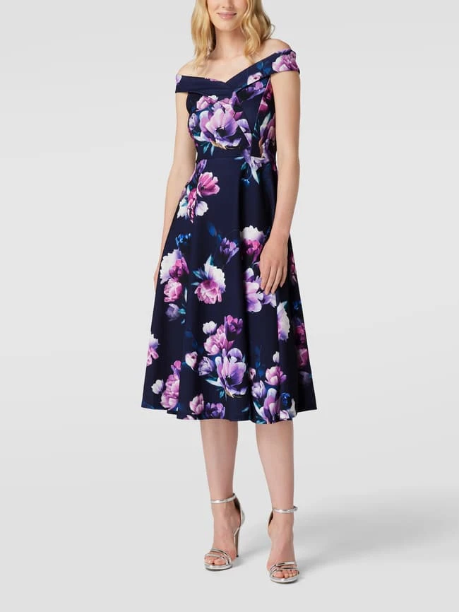 Das Cocktailkleid von Lipsy ist aus einem elastischen Material-Mix gefertigt und tailliert geschnitten. Es zeigt sich mit floralem Allover-Muster und V-Ausschnitt mit Drapierung.