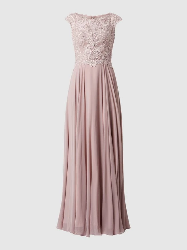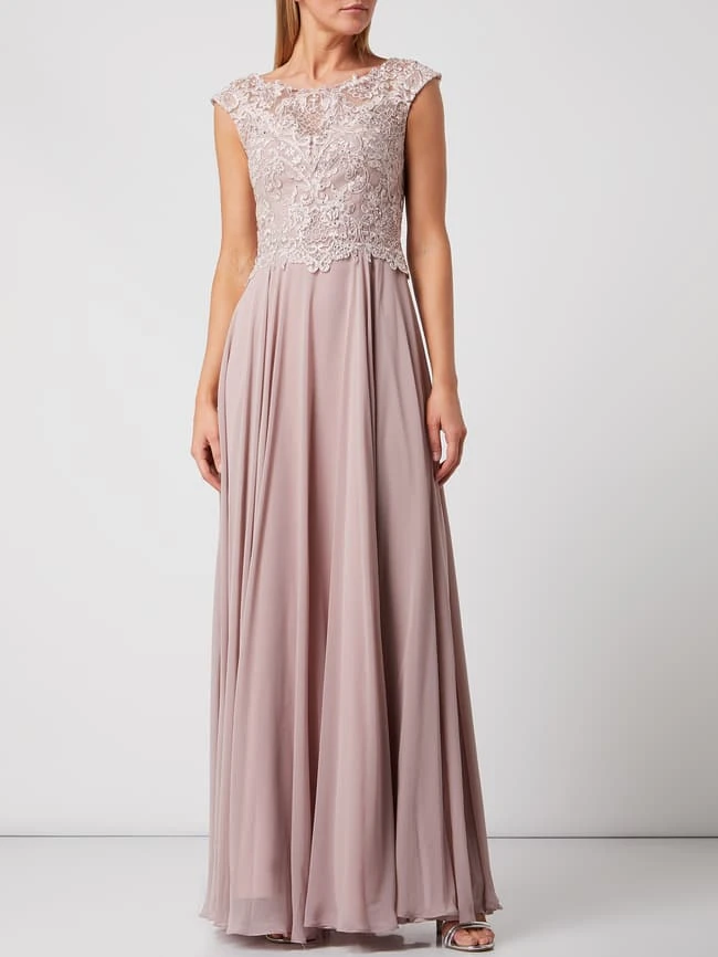 Das Abendkleid von LUXUAR LIMITED ist aus Mesh und Chiffon gefertigt. Es zeigt sich in taillierter Passform mit wattierten Cups, Stickereien und Ziersteinen.