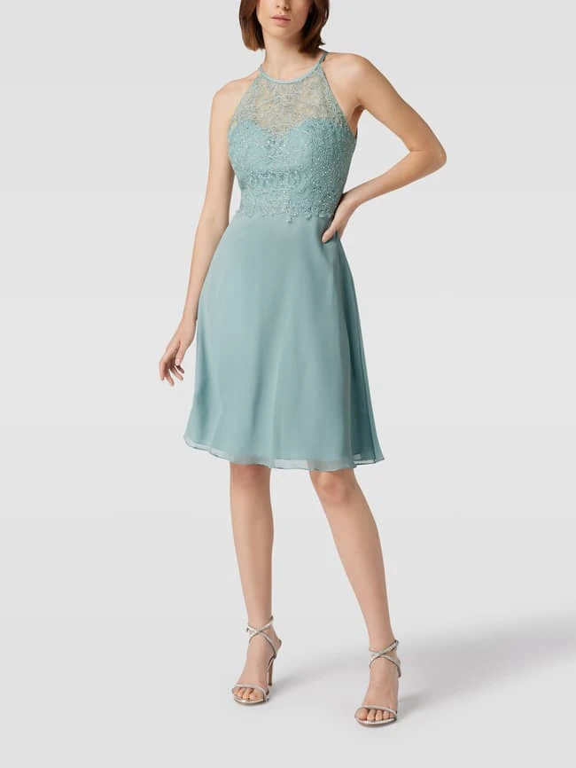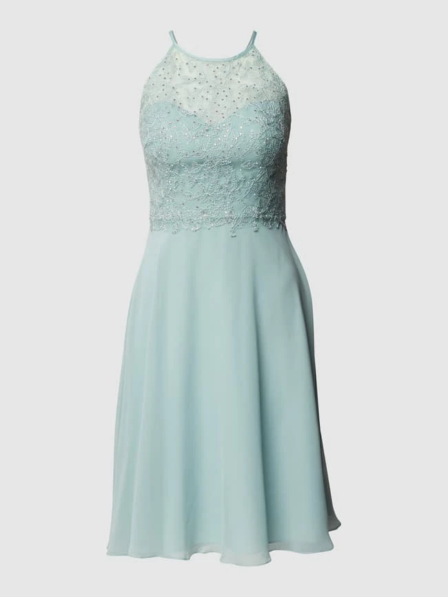 Das Cocktailkleid von LUXUAR FASHION ist aus einem strapazierfähigen Material gefertigt und tailliert geschnitten. Es zeigt sich mit Paillettenbesatz und Netz-Einsatz mit floralen Stickereien.