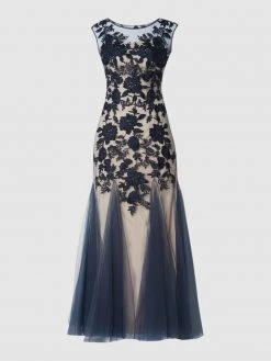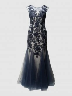 Das Abendkleid von Mascara ist aus Tüll und Chiffon gefertigt. Es zeigt sich mit floralen Stickereien, Strasssteinen und Nahtreißverschluss auf der Rückseite.