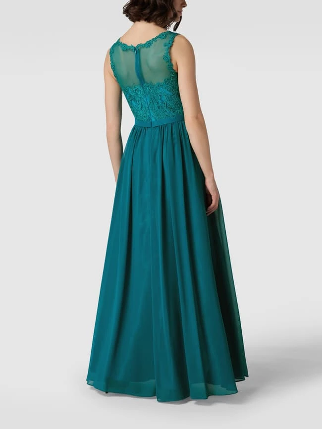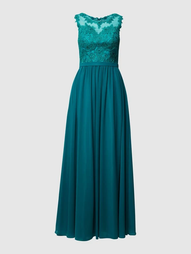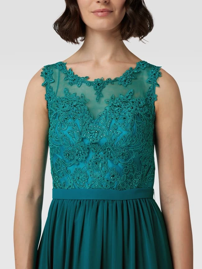 Das Abendkleid von Mascara ist aus strapazierfähigem Material gefertigt und tailliert geschnitten. Es kommt mit Rundhalsausschnitt, floralen Stickereien, Ziersteinen sowie doppellagigem Rockteil.