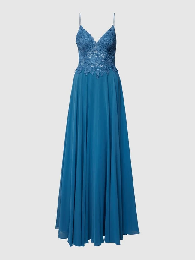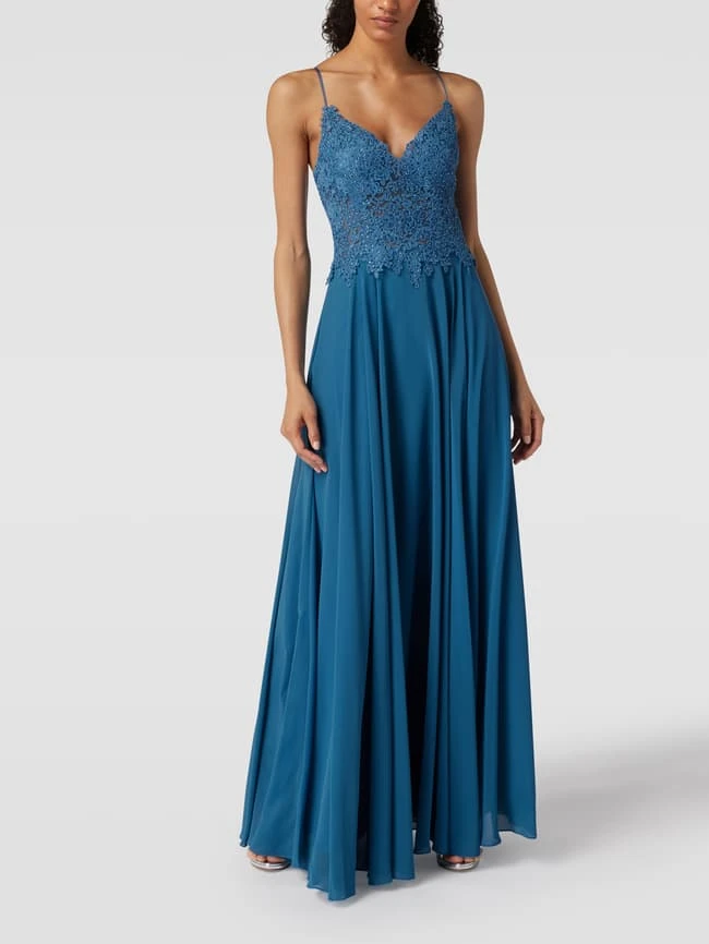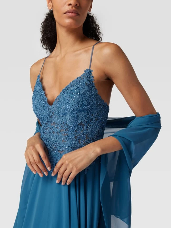 Das Abendkleid von Mascara ist aus einem strapazierfähigen Material gefertigt und tailliert geschnitten. Es zeigt sich in Midilänge mit floraler Stickerei, Strasssteinbesatz, Herz-Ausschnitt und semitransparenten Einsätzen.