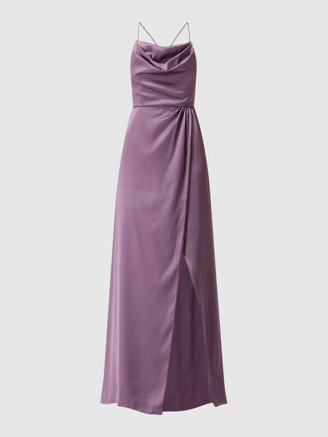 Das Abendkleid von Maya Deluxe ist aus Satin gefertigt und tailliert geschnitten. Es zeigt sich in Wickel-Optik mit Wasserfall-Ausschnitt, gekreuzten Spaghettiträgern und hohem Seitenschlitz.