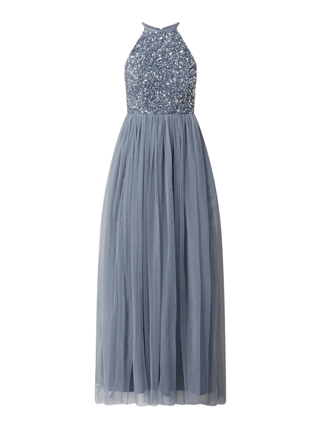 Das Abendkleid von May Deluxe ist aus Mesh gefertigt und taillierter geschnitten. Es kommt mit Rundhalsausschnitt, Pailletten und blickdichtem Unterkleid.