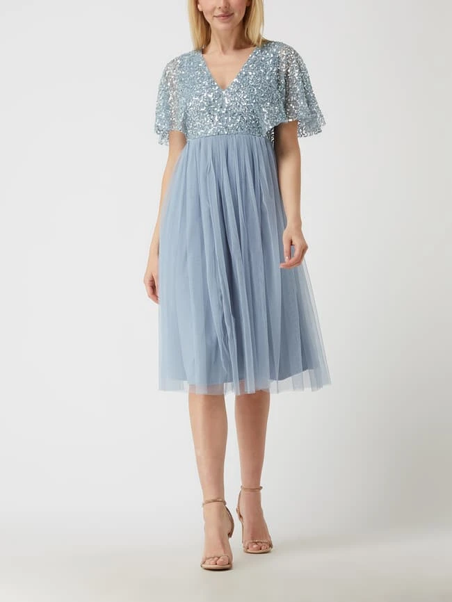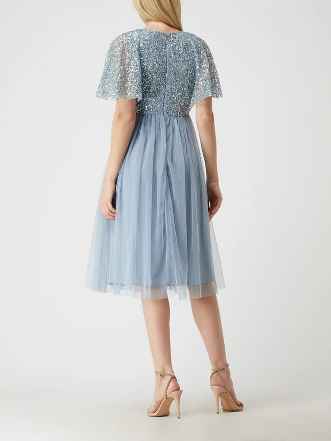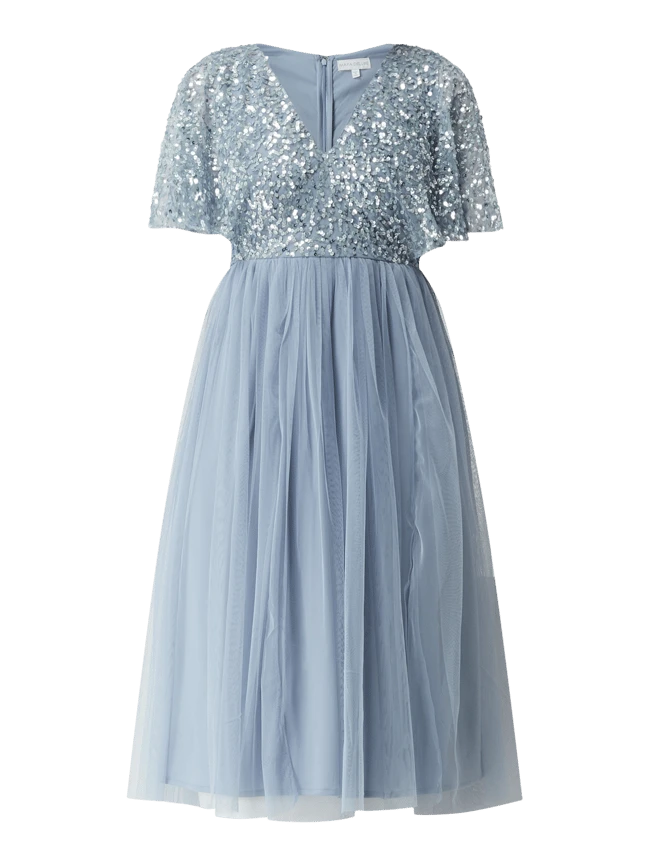 Das Cocktailkleid von Maya Deluxe ist aus Mesh gefertigt und tailliert geschnitten. Es kommt mit V-Ausschnitt, Pailletten und Nahtreißverschluss.