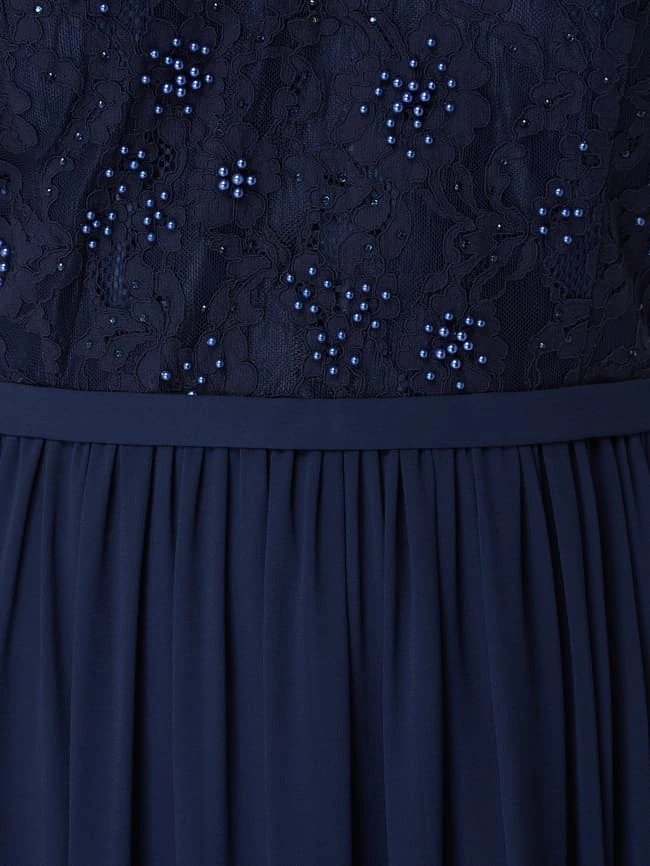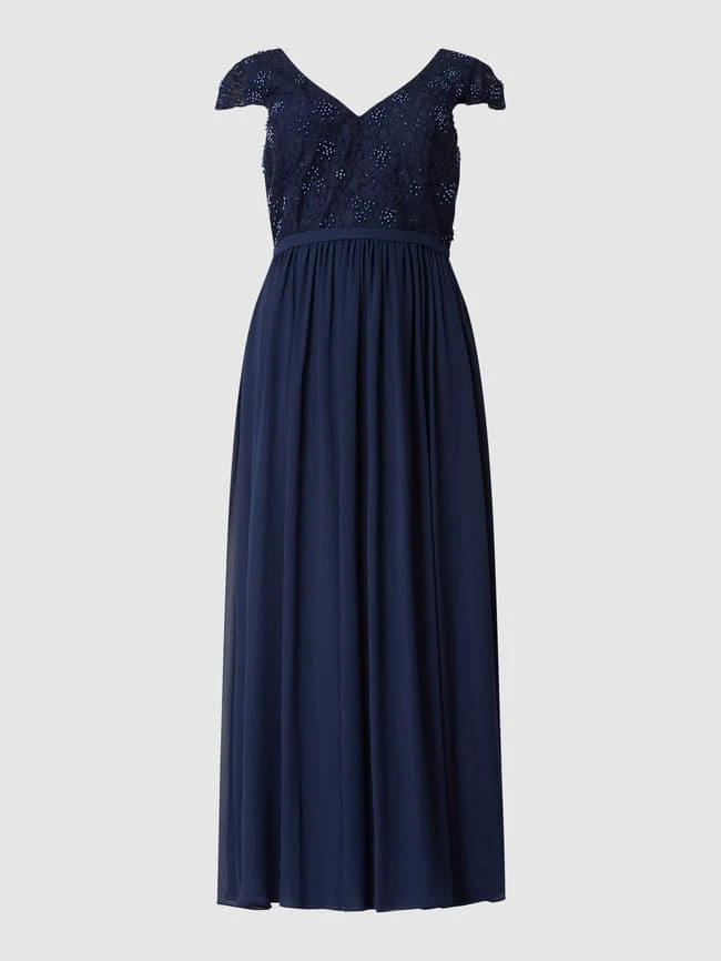 Das Abendkleid von My Mascara Curves ist aus Spitze und Chiffon gefertigt. Es zeigt sich in taillierter Passform mit V-Ausschnitt, Zierperlen und ausgestelltem Rockteil.