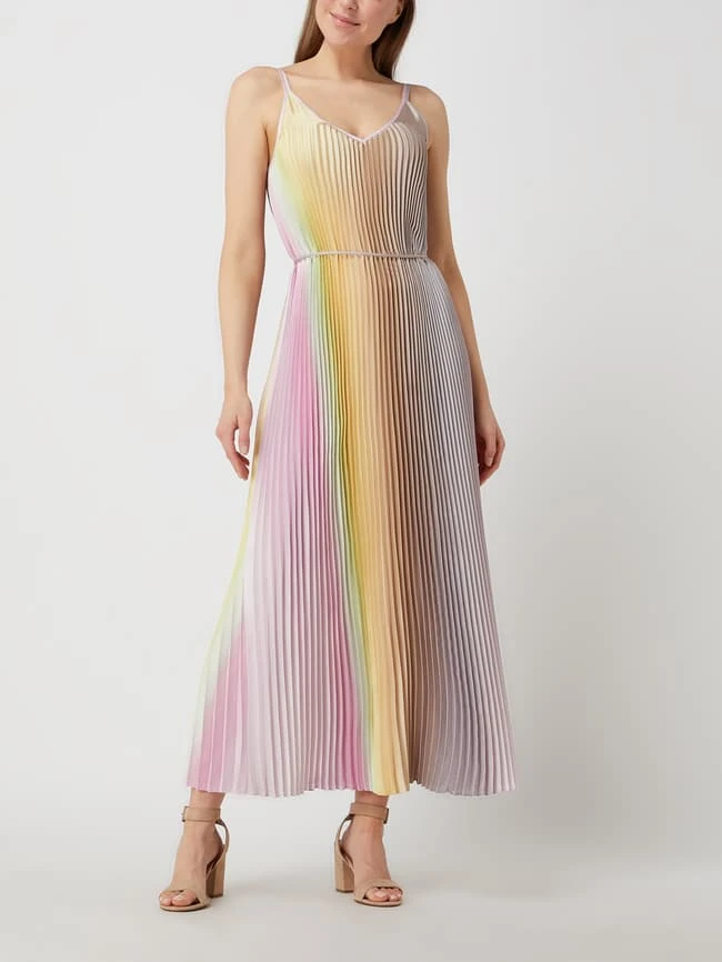 Das Maxikleid von s.Oliver BLACK LABEL ist aus Krepp gefertigt und tailliert geschnitten. Es zeigt sich mit Farbverlauf, Plisseefalten und Spaghettiträgern.