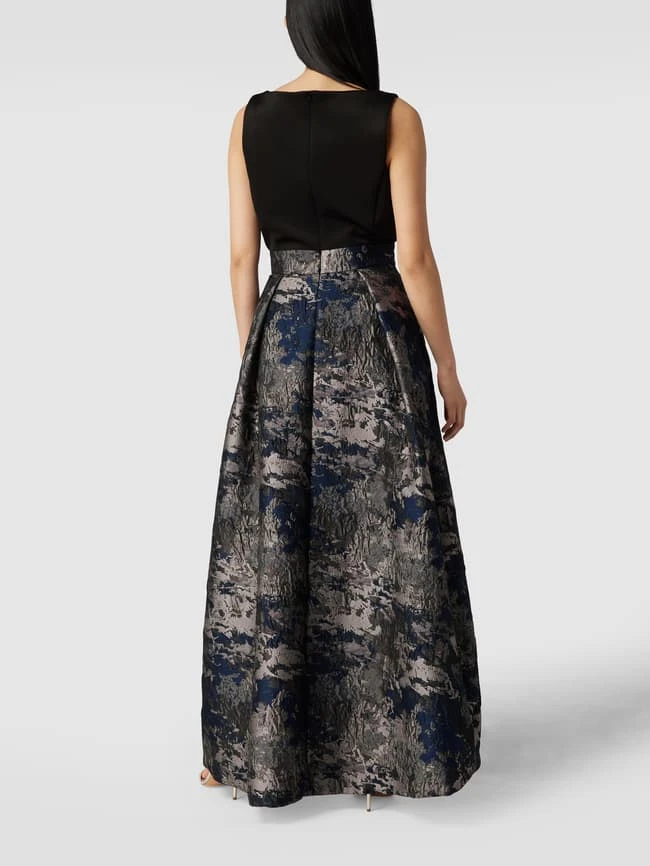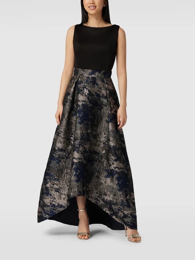 Das Abendkleid von SWING ist aus strapazierfähigem Material gefertigt und tailliert geschnitten. Es kommt im Vokuhila-Look mit Taillenpasse, grafischem Allover-Muster und breiten Trägern.