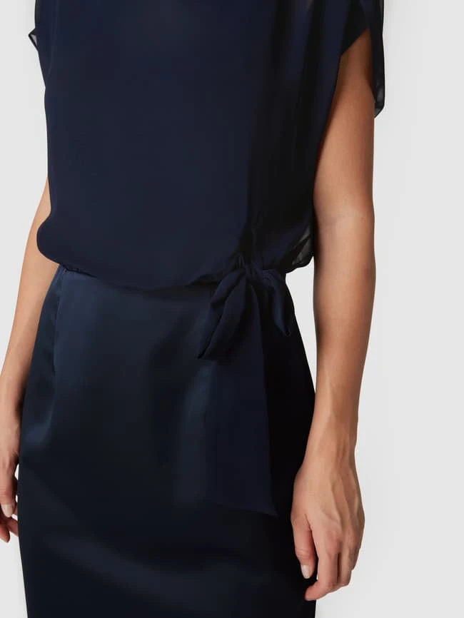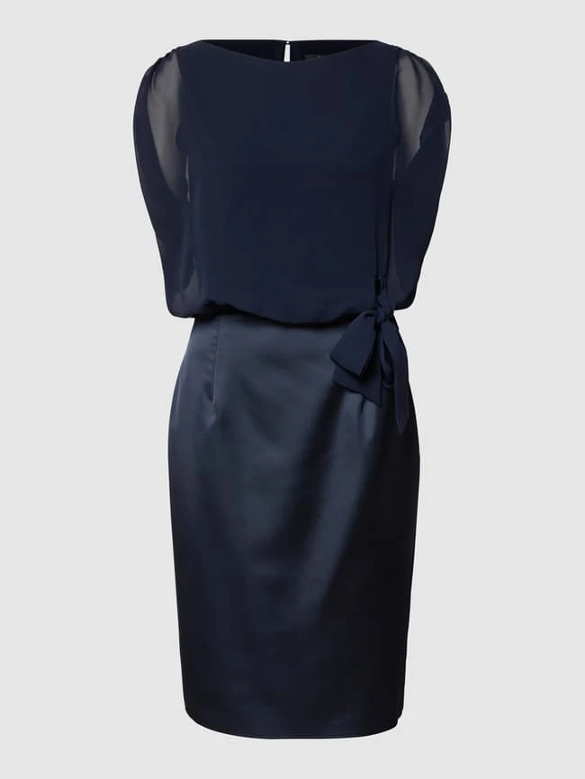 Das Cocktailkleid von SWING ist aus einem Material-Mix mit Stretch-Anteil gefertigt und tailliert geschnitten. Es kommt mit U-Boot-Ausschnitt, dekorativer Schnürung und abgesetzter Rockpartie.