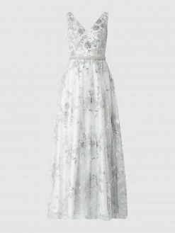 Das Abendkleid von unique ist aus Tüll gefertigt und tailliert geschnitten. Es zeigt sich mit Srasssteinen, sehr weit ausgestelltem Rockteil und tiefem Rückenausschnitt.