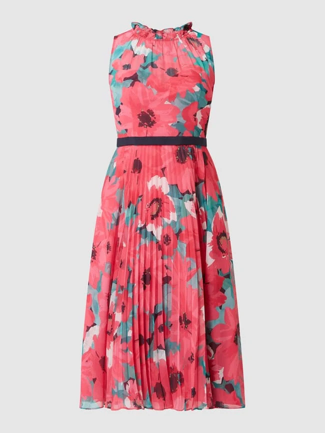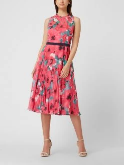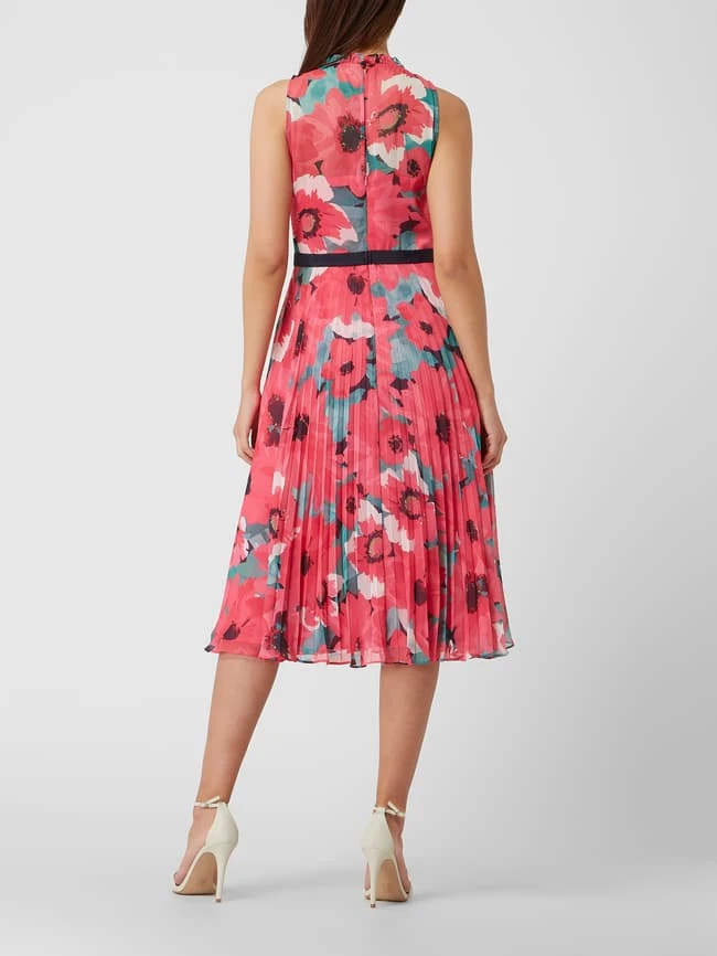 Das Cocktailkleid von V by Vera Mont ist aus Krepp gefertigt und tailliert geschnitten. Es zeigt sich mit floralem Muster, Rüschen und Plisseefalten.