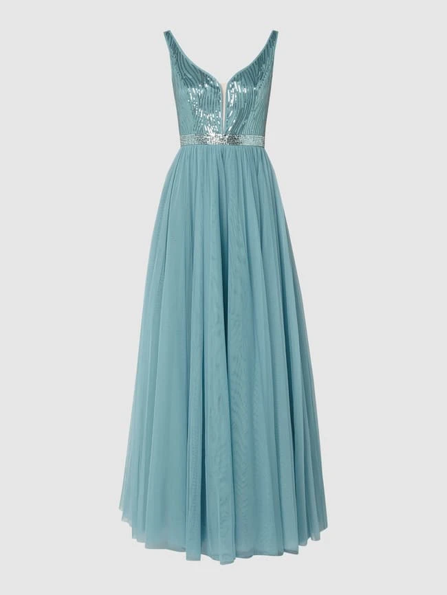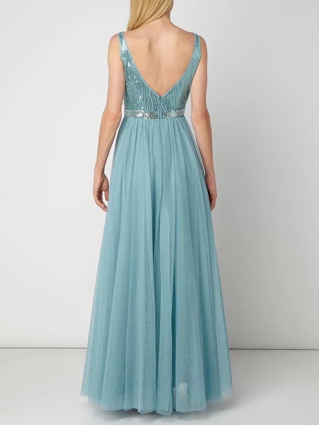 Das Abendkleid von Vera Mont ist aus Tüll gefertigt und tailliert geschnitten. Es zeigt sich mit Herz-Ausschnitt, Pailletten-Applikationen und weit ausgestelltem Rockteil.